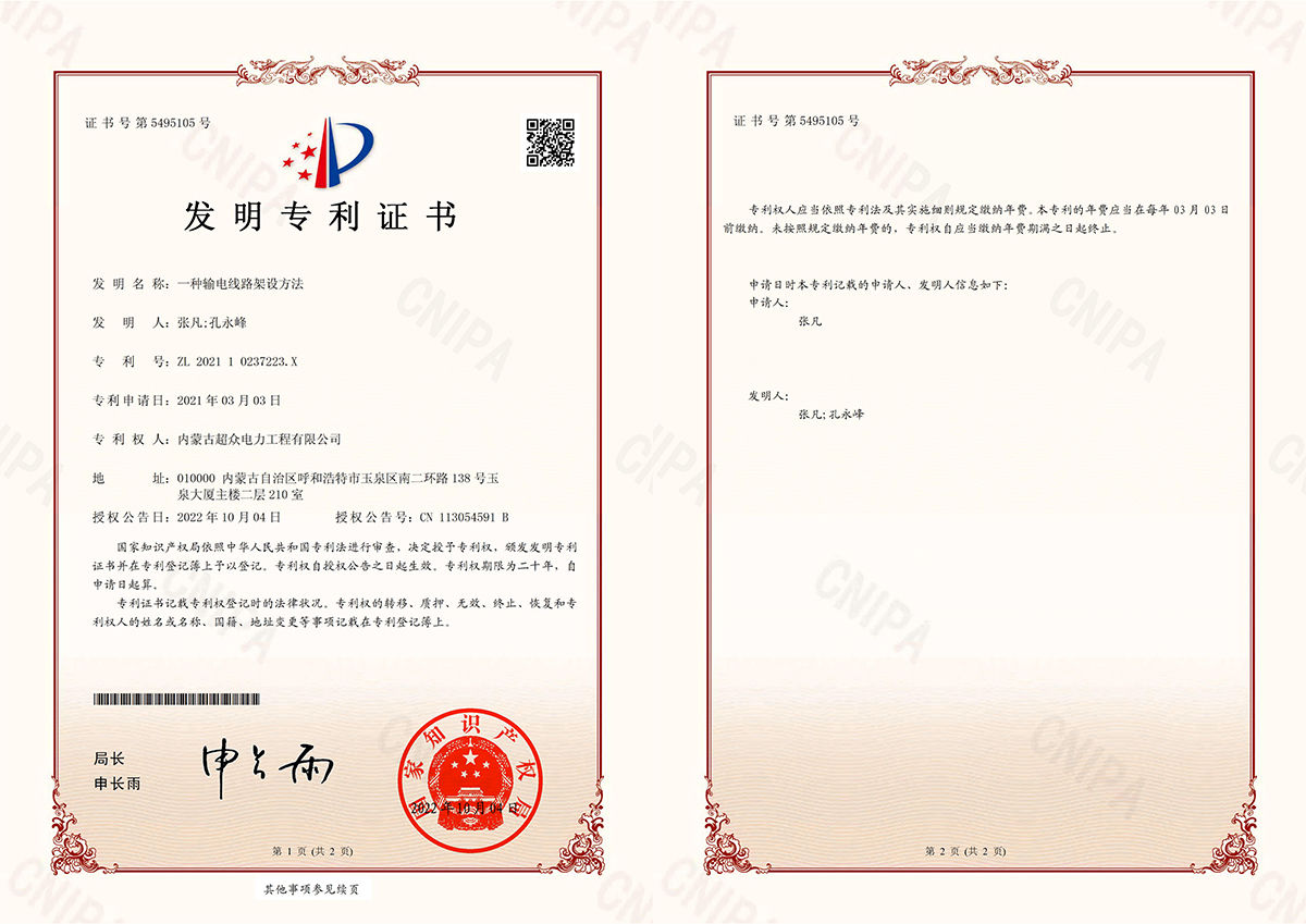 發(fā) 明 專 利 證 書 一種輸電線路架設(shè)方法
